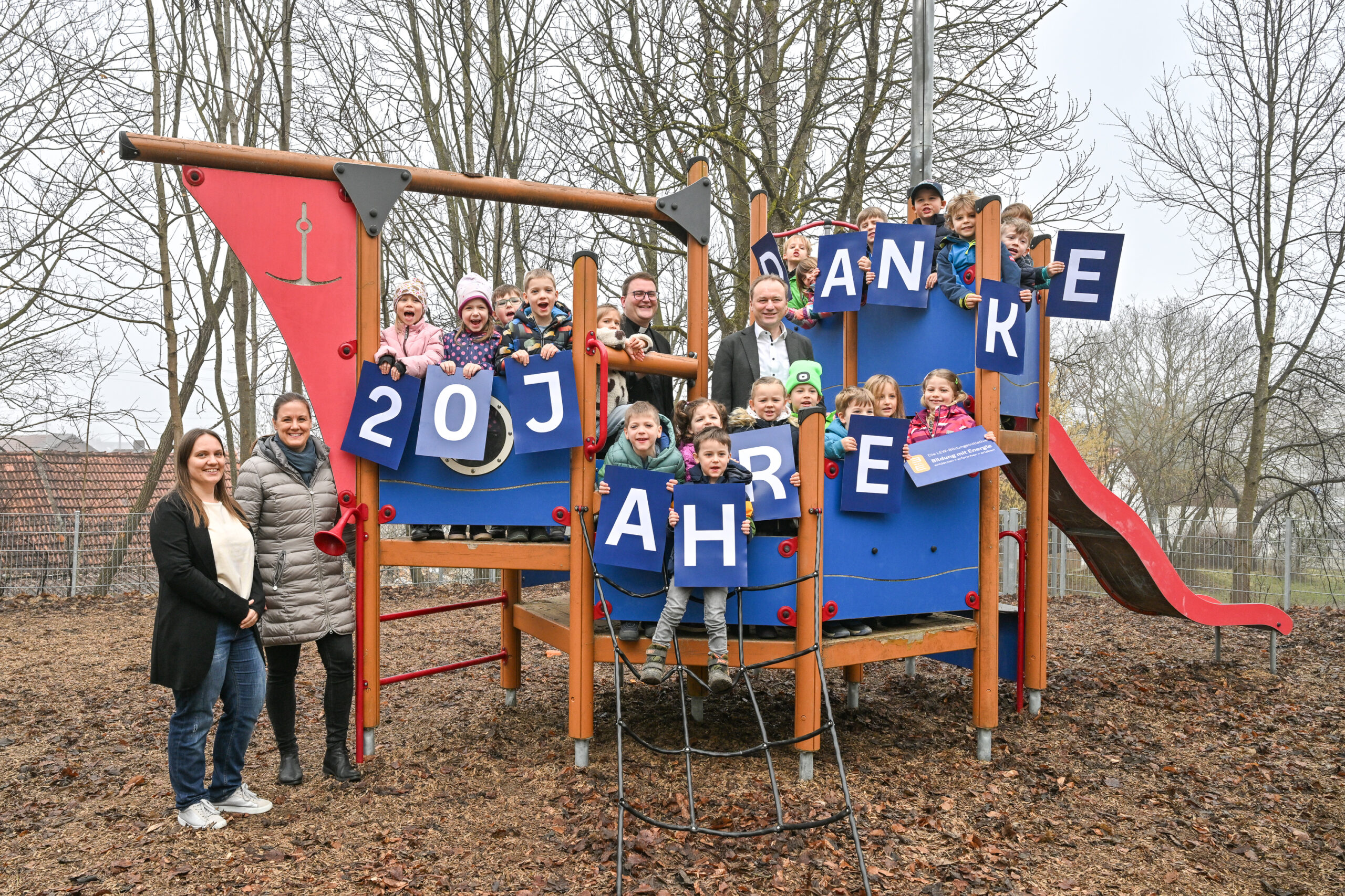 Für die LEW-Bildungsinitiative 3malE übergab Michael Smischek das Entdecker-Paket an die Vorschulkinder, die stellvertretend für alle Kinder des Kinderhauses zur Übergabe eingeladen waren sowie an die Kitaleitung Frau Sarah Fischer mit ihrer Stellvertreterin Alexandra Mayer.  Neben weiterem pädagogischem Personal waren die Vorsitzenden des Elternbeirats, Bürgermeister Klaus Förster, Frau Dr. Franziska Kolek und Herr Pfarrer Ehehalt mit seinem Praktikanten anwesend und freuten sich mit den Kindern über die Entdecker-Kister.  Die Kinder bedankten sich mit dem passenden Lied „Wackelkontakt“ vom OIMARA bei der LEW.
